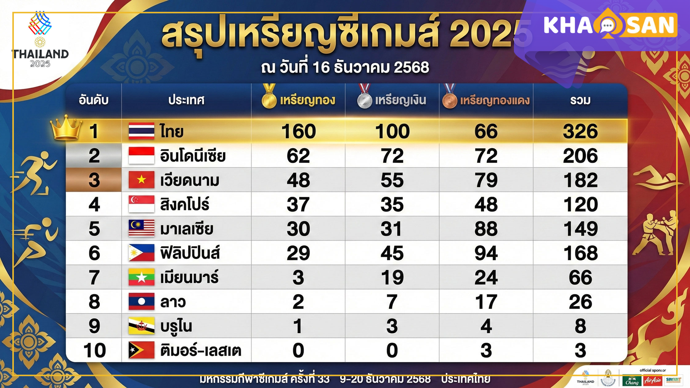 อัปเดตล่าสุด (16 ธ.ค.) 🚀 เข้าสู่วันที่ 7 ของการแข่งขัน ไทยยังเดินหน้าโกยเหรียญไม่พัก! ล่าสุดกวาดไปแล้ว 160 เหรียญทอง ครองเจ้าเหรียญทองแบบทิ้งห่างอันดับ 2 อินโดนีเซีย เกือบ 100 เหรียญ! เรียกว่านำม้วนเดียวจบแน่นอนครับ