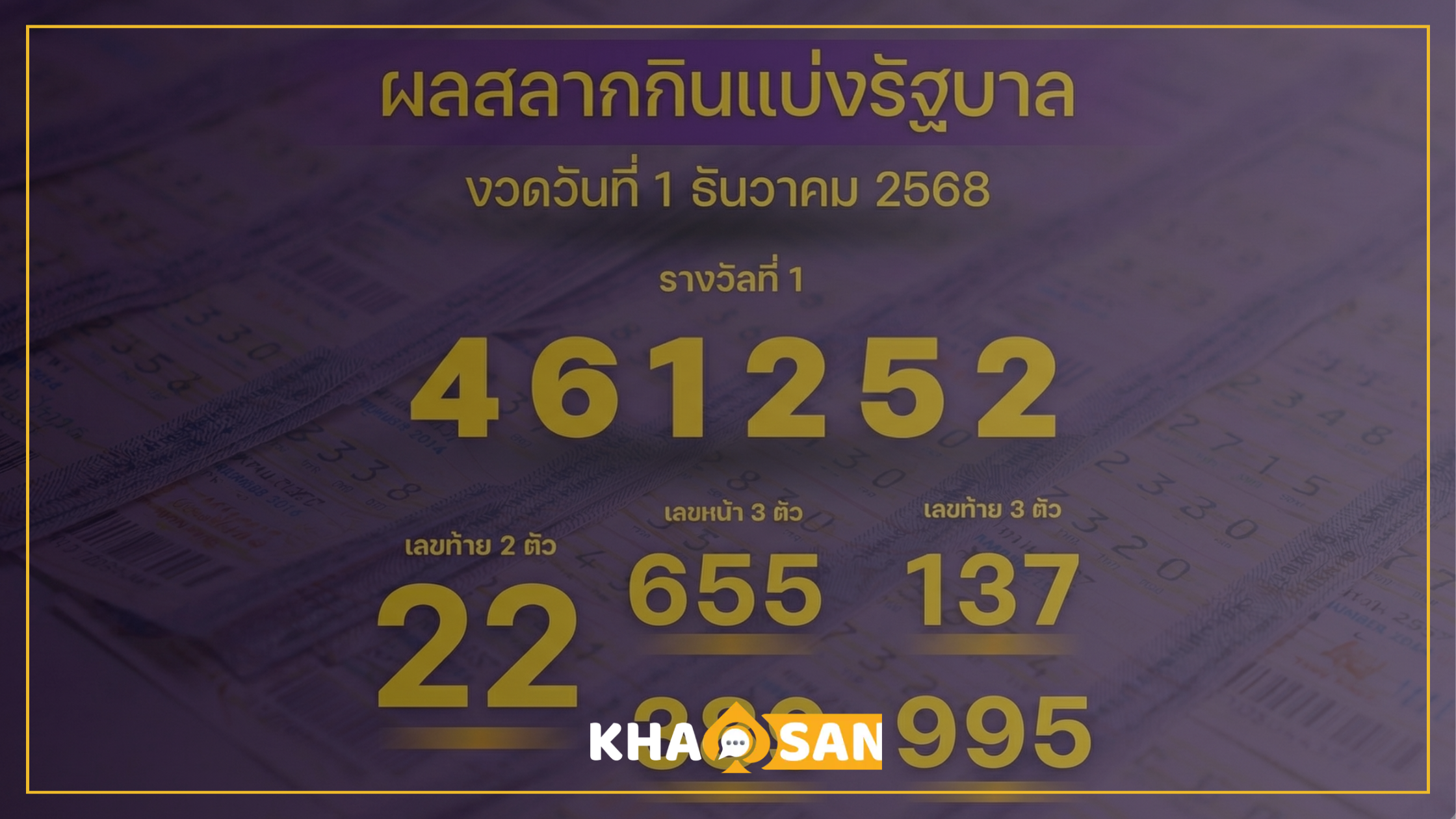 💰 ผลสลากกินแบ่งรัฐบาล งวดวันที่ 1 ธันวาคม 2568